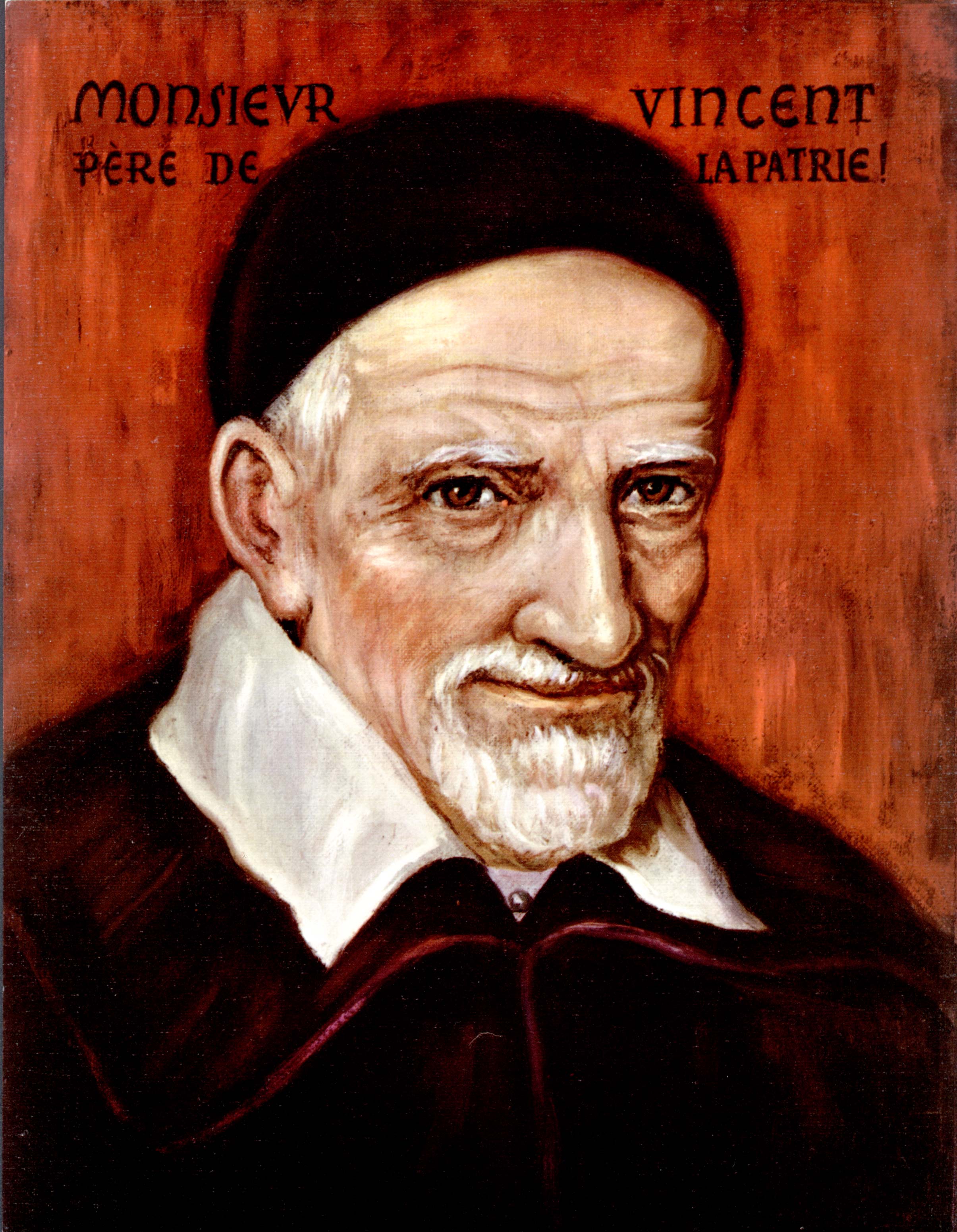Oil painting, Vincent de Paul, cassock, mantle; painted for tercentenary of his death, 1960, artist, Henrion; reproduced commercially, location of original unknown; text: "Father of the country"