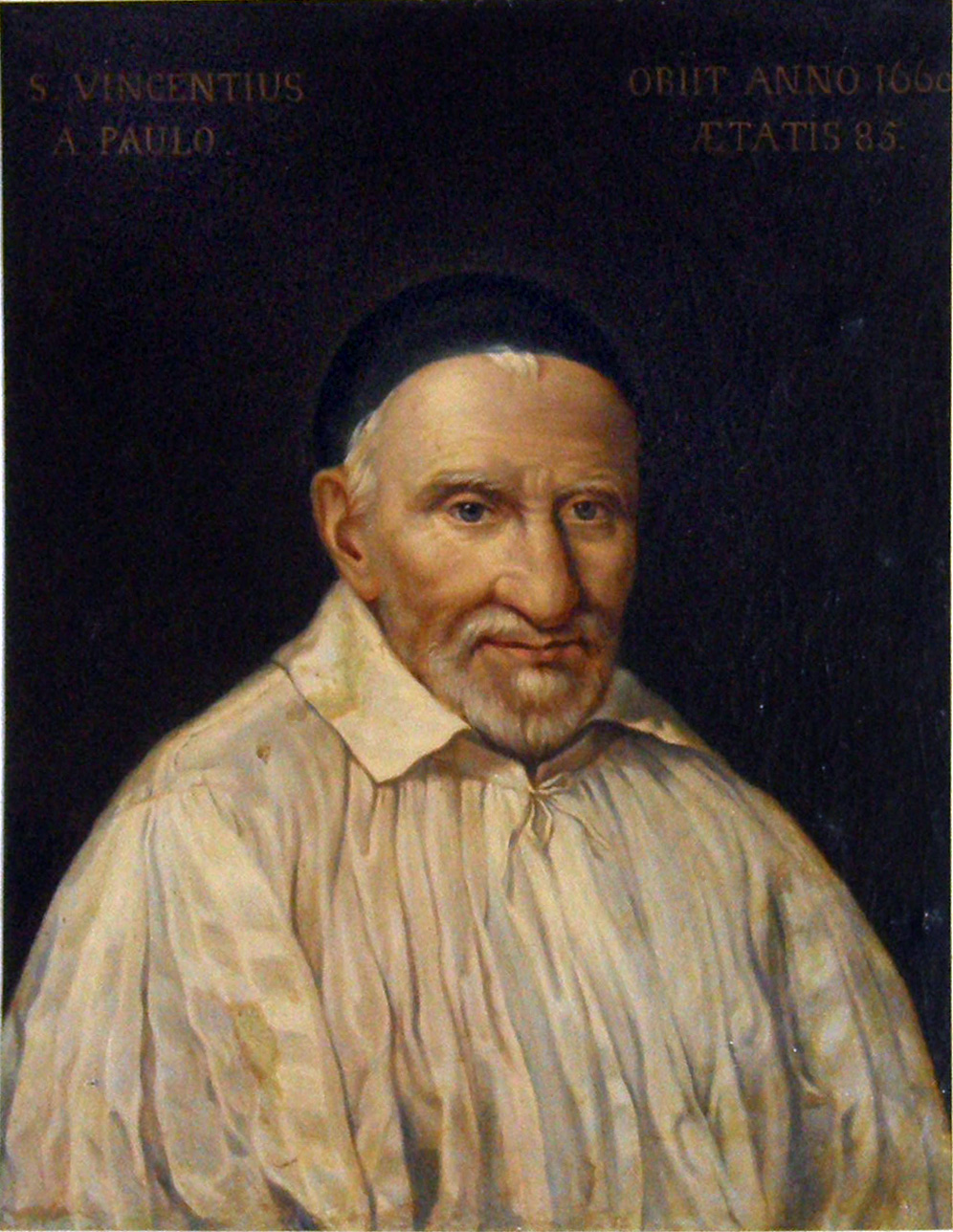 Oil, Vincent de Paul, cassock, surplice, skullcap, inscriptions above: Died 1660, age 85; original in Daughters of Charity motherhouse, Paris