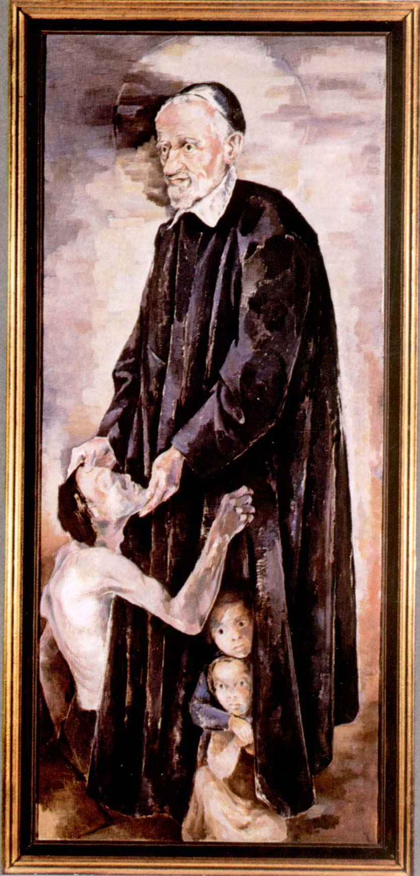 Oil on canvas, Vincent de Paul, cassock, mantle, skullcap, standing, with poor man and two children at his feet; original in mother house of Sisters of Charity, Freiburg-im-Breisgau (Fribourg en Bris); artist: Rudolf Kaufhold, undated