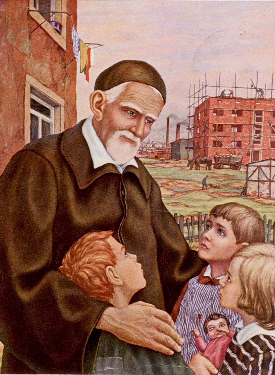 Painting; Vincent de Paul, in buttoned cape, skullcap, with three children (girl with doll); poor housing, new construction in background; original in Freiburg-im-Breisgau (Fribourg en Bris)