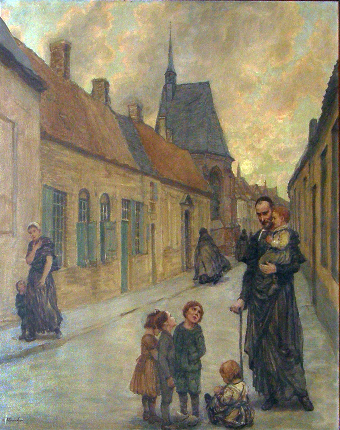Oil painting; Vincent de Paul, holding walking stick; carrying child in street of a town at sunset; original in CM house, Lippstadt