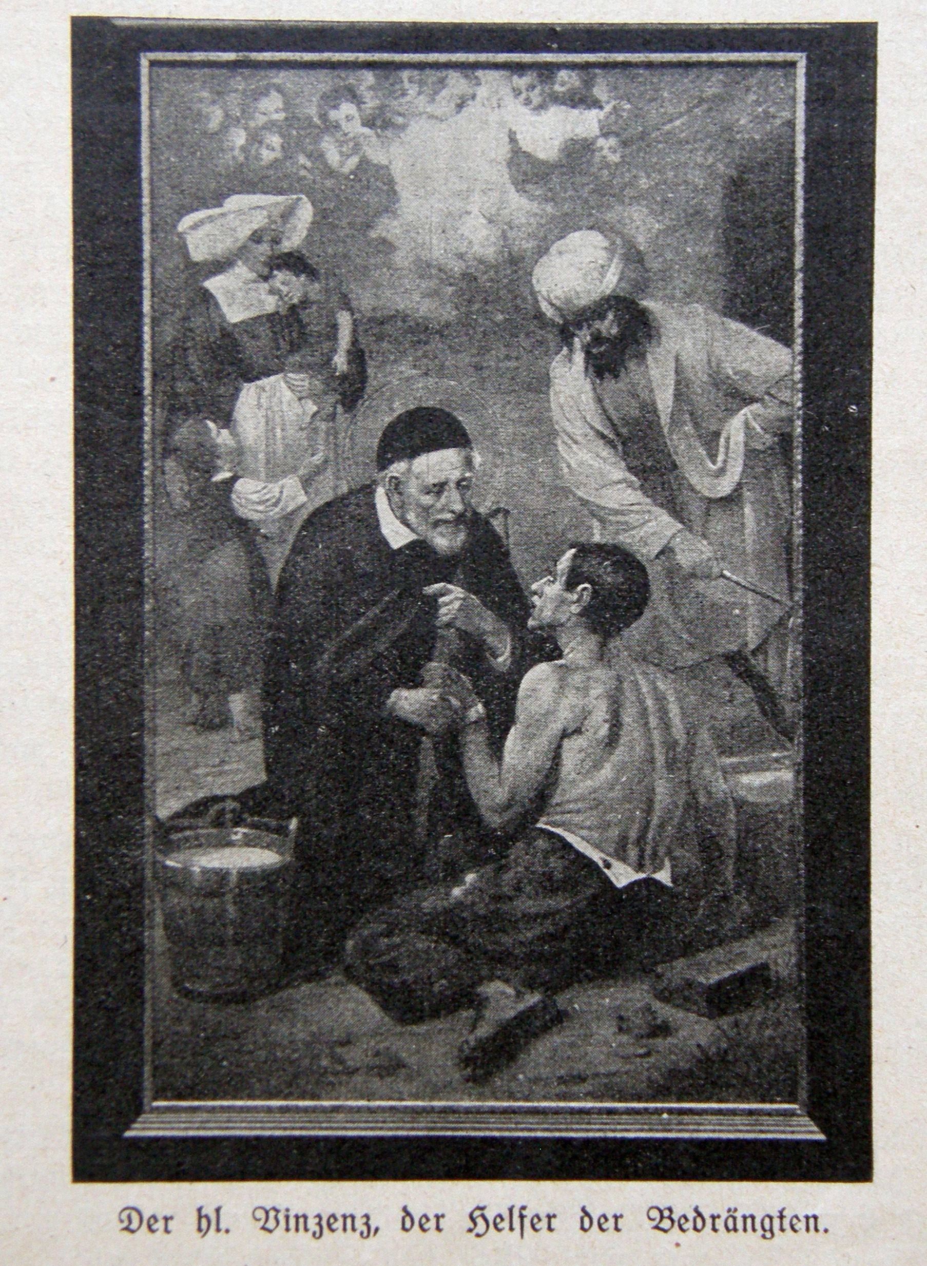 Photograph of painting (location unknown); Vincent de Paul, kneeling, with poor man; Sister and children behind; Turk at right in gesture of threat; copy in archives of German province, Trier