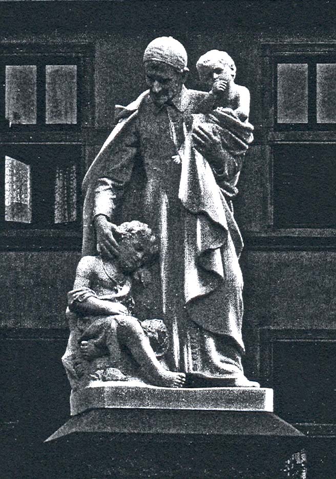 Vincent de Paul, two children; outdoor marble statue, Bonn; moved to St. Remigius church, Bonn; sculpted 1896