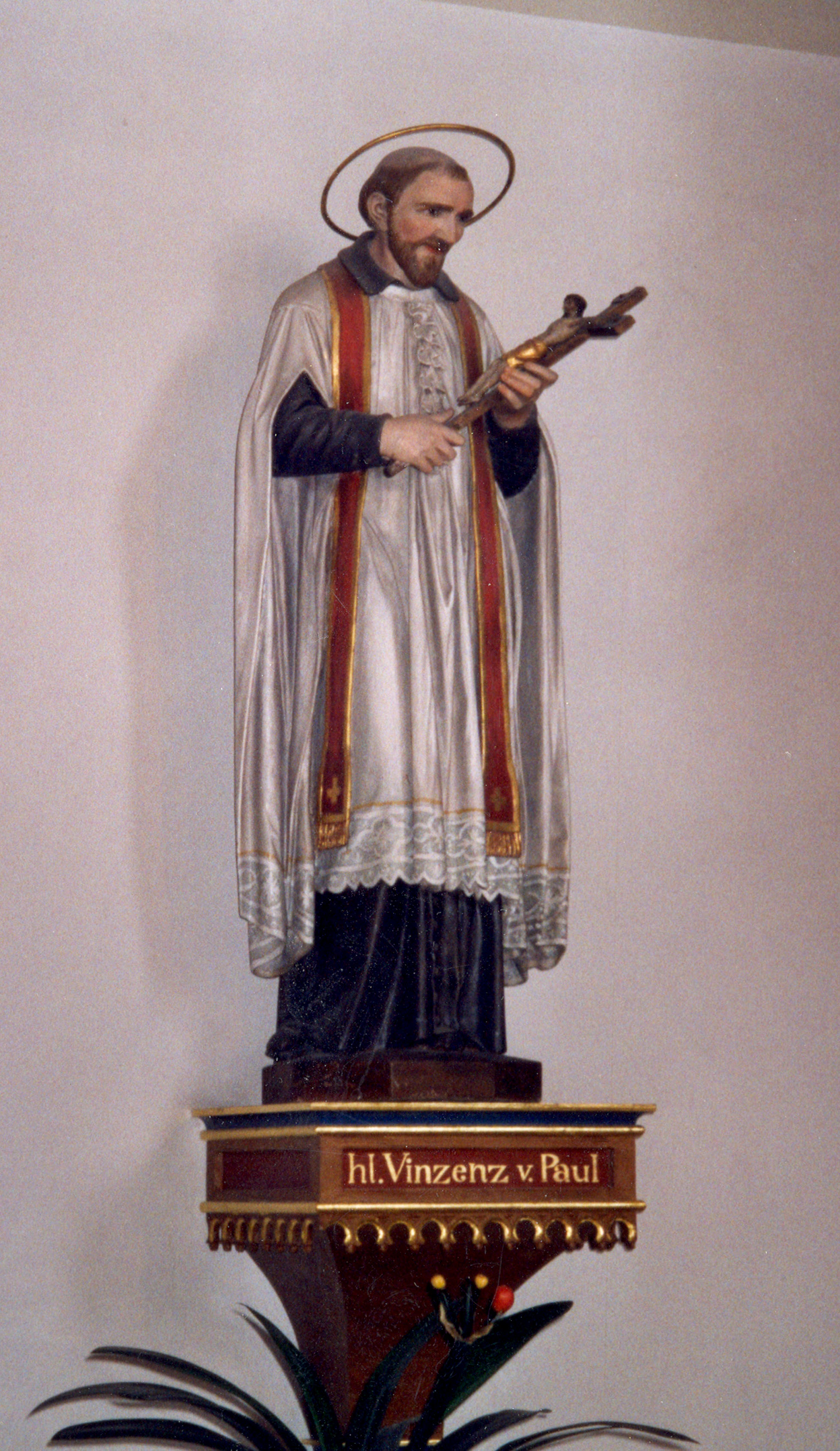 Vincent de Paul, cassock, surplice, red stole, contemplating crucifix in his hands. Original in parish, Neuberg-Donau