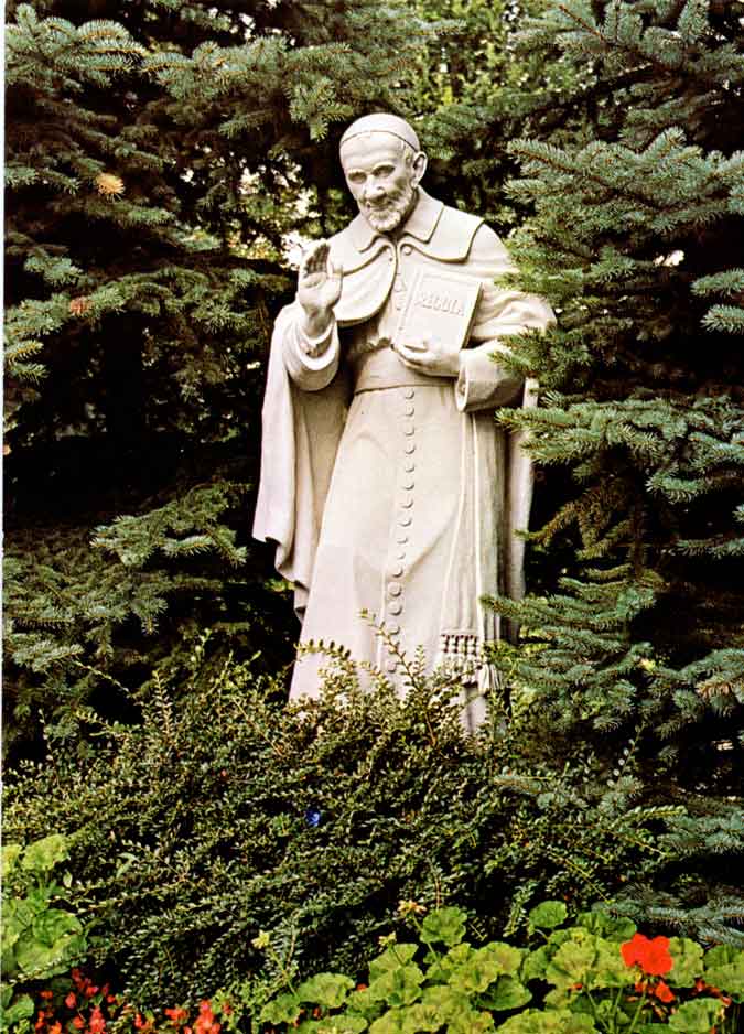 Carved stone statue, Vincent de Paul, cassock and cape, holding book of Rules, hand raised in blessing; in a garden. Original at motherhouse of Sisters of Charity, Hildesheim; internet image