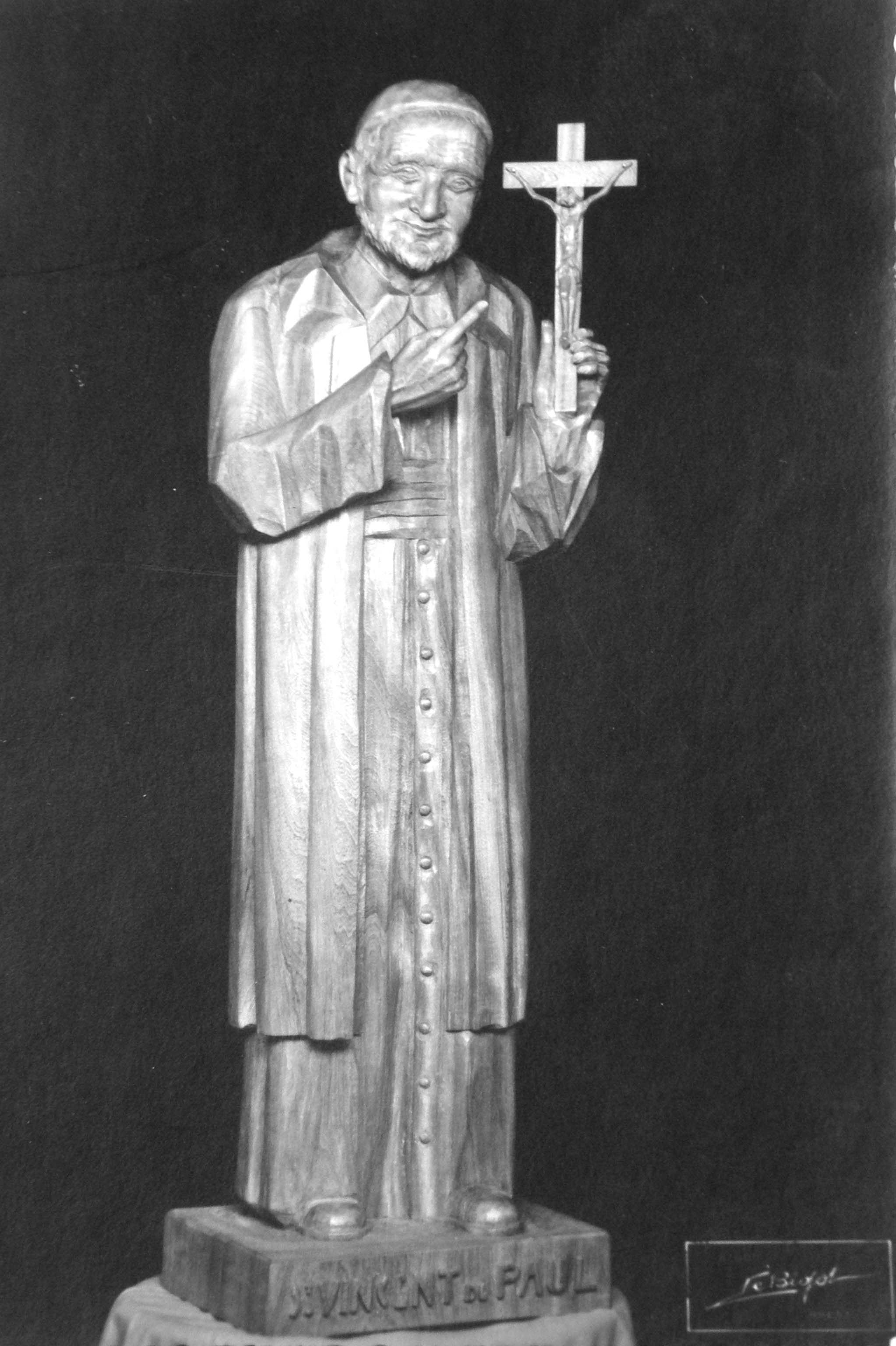 Carved wooden statue, Vincent de Paul gestures toward crucifix. Commercial photo in Vincentian Curia archives, Rome. Original in Germany.