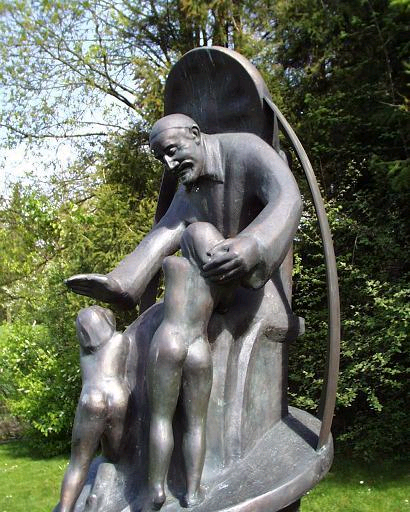 Bronze statue, Vincent de Paul, seated with two children. Original at Realschule Vinzenz von Paul, Kloster Indersdorf in Indersdorf. Internet image