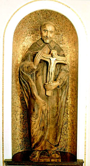 Vincent de Paul, holding crucifix; statue standing in gold mosaic niche; original in mother house of Sisters of Charity, Hildesheim