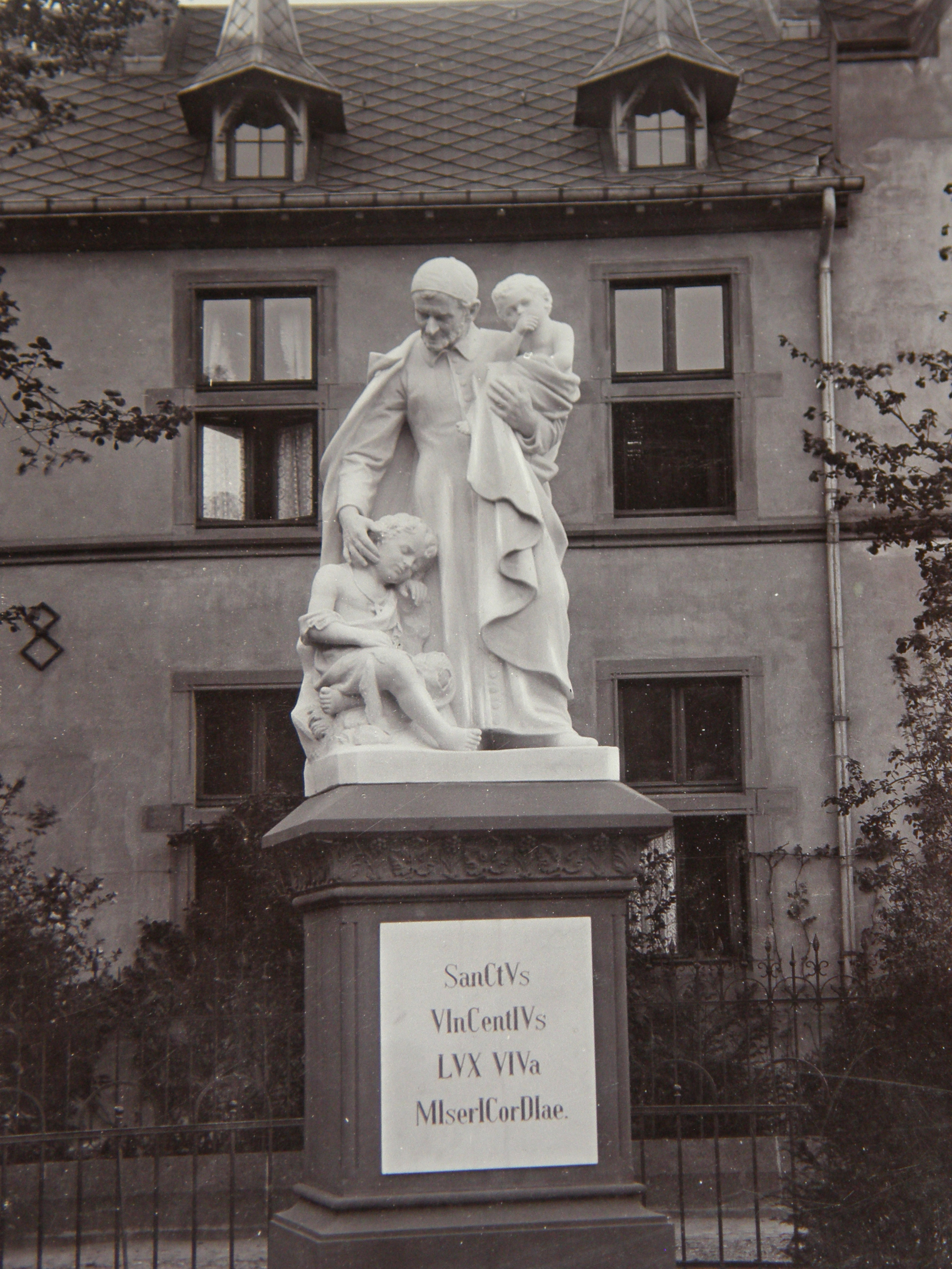 Outdoor statue in former Vinzenz Platz in Bonn, now at St. Remigius church; Vincent de Paul, standing, cassock, cape, skullcap, two children; Latin text: "St. Vincent, Living Light of Mercy." Sepia photo, Gunth collection, Paris