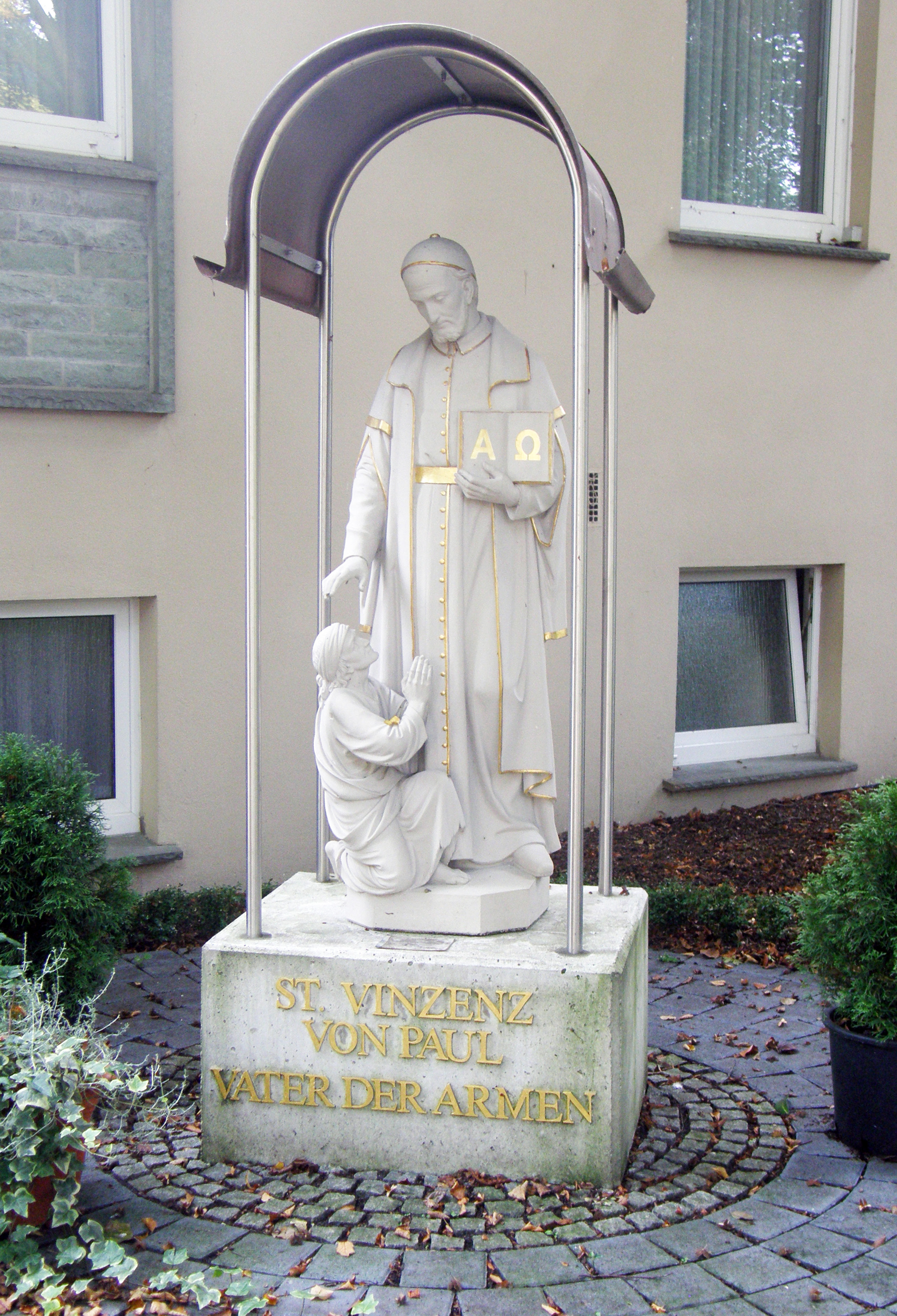 Stone statue, restored; Vincent, holding a book and a poor person; at CM house, Lippstadt; a gesture of evangelization