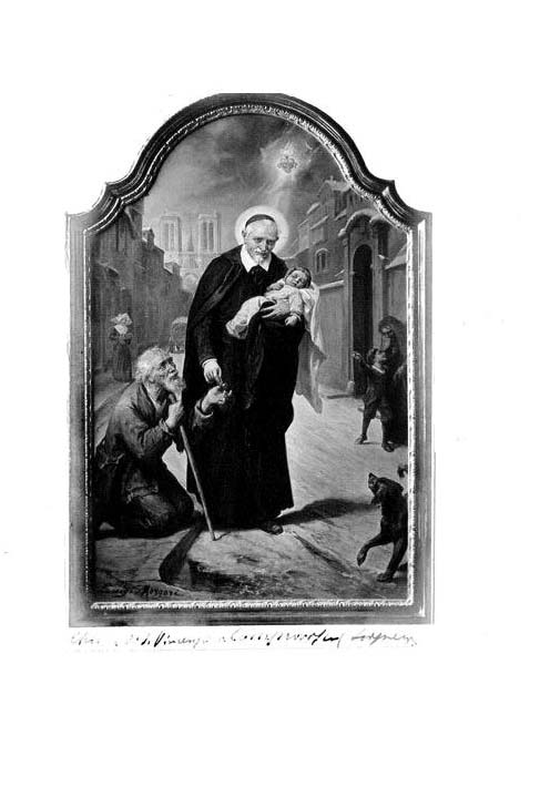 Photograph of painting by Luigi Morgari, Comprovasco, Switzerland; Vincent de Paul with poor; Daughter of Charity in back; snow scene in Paris, Notre Dame de Paris; burning heart of charity above