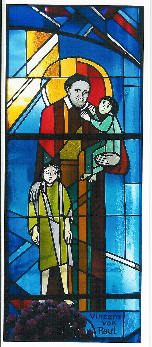 Vincent de Paul, halo, standing, with two children. Original in Worishofen hospice; courtesy of Alex Jernej, CM