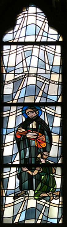 Vincent de Paul, standing, cassock, mantle, skullcap; holding child in a blanket; poor person kneeling at his side; internet image