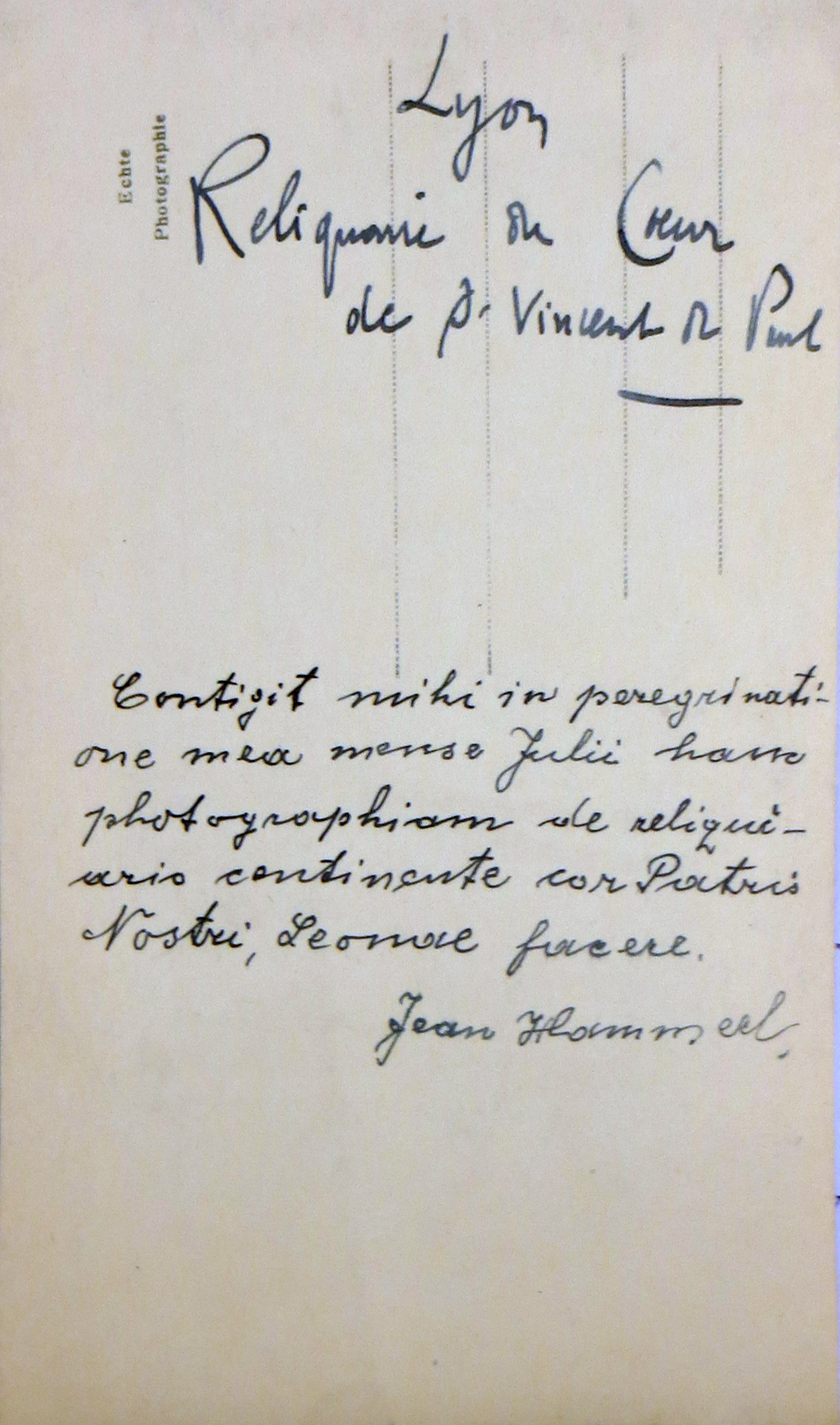 Text: "It happened to me on my pilgrimage to Lyons in July that I took this photograph of the reliquary containing the heart of our Father.