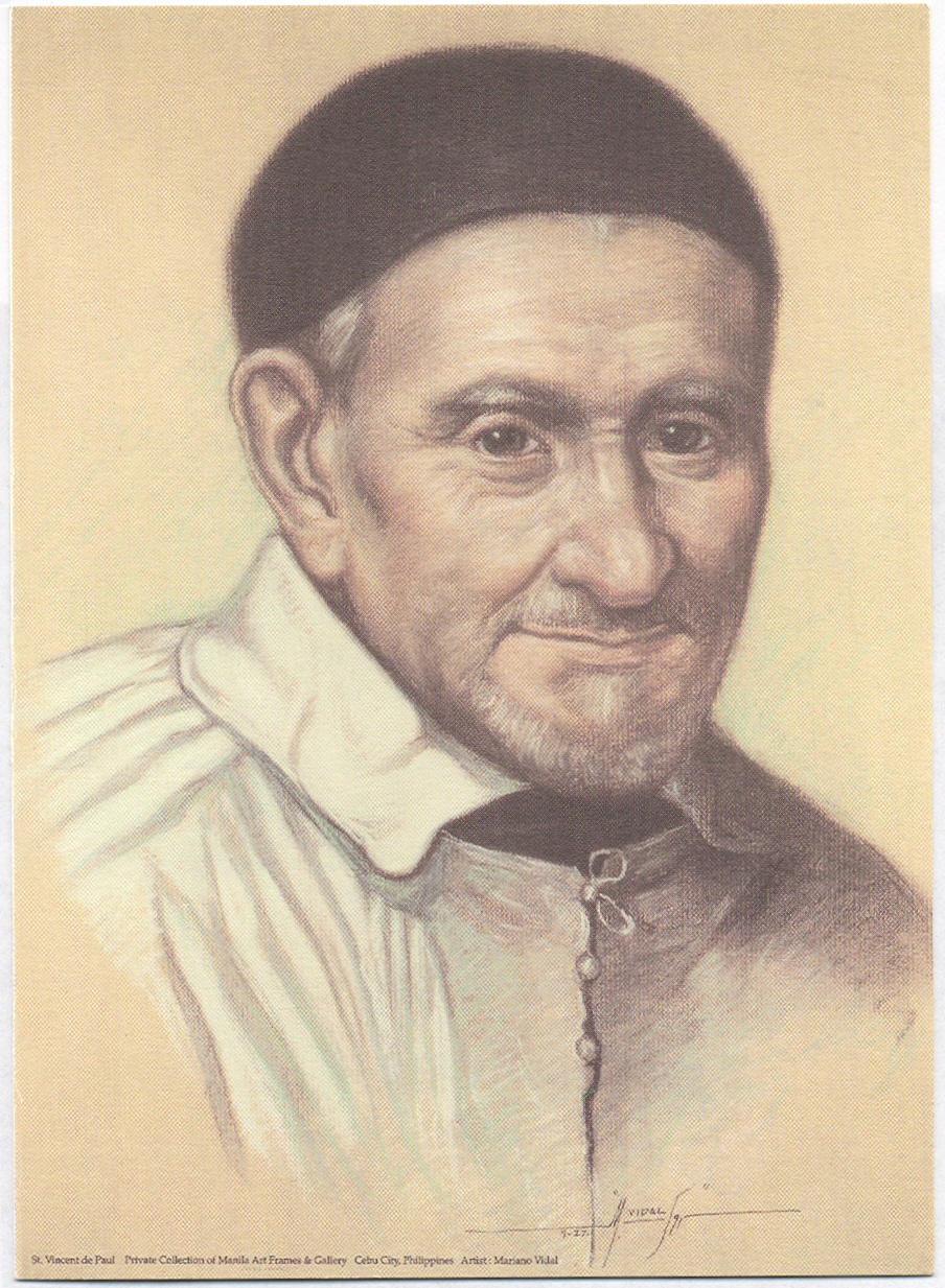Vincent de Paul, cassock, surplice; bust; light background; commercial copy; original in privat collection of Manila Art Frames & Gallery, Cebu City; artist Mariano Vidal (may be copyrighted)