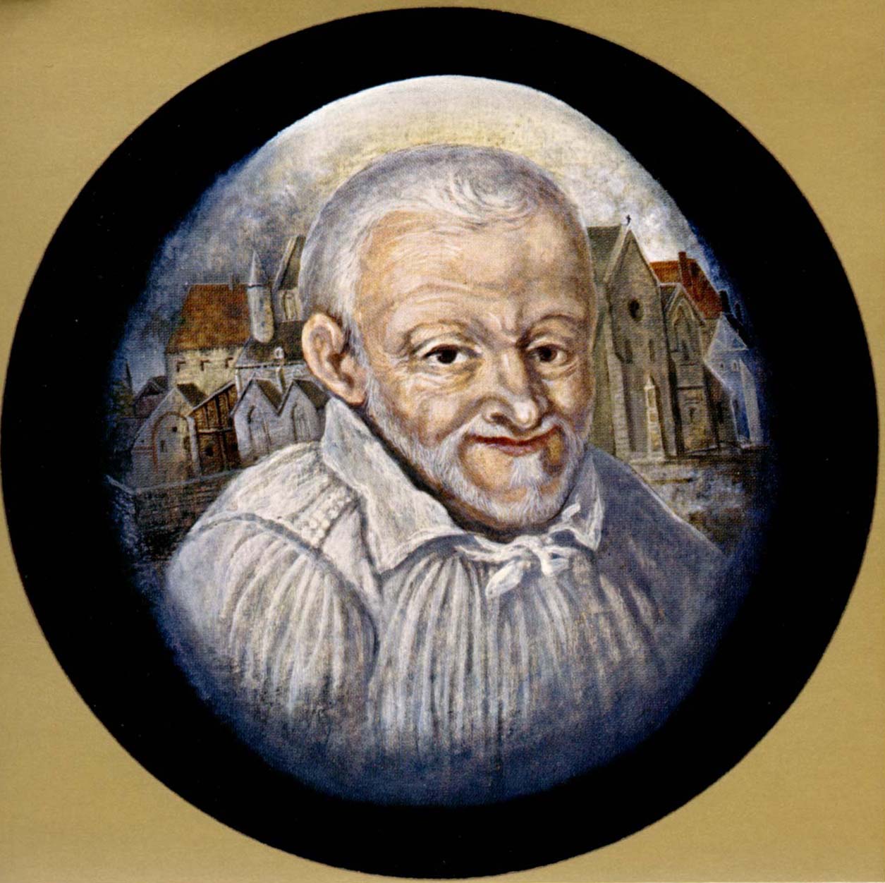 Round painting; Vincent de Paul, surplice, with St. Lazare buildings in background; artist, Franz Luby; original in St. George College, Istanbul; based on contemporary miniature portrait