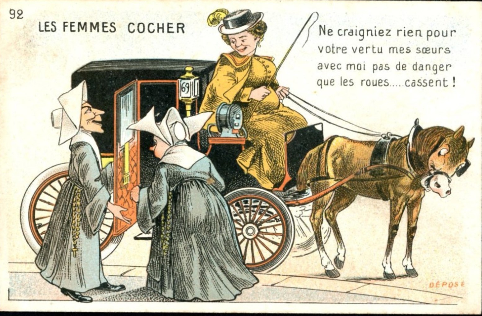 Text: You have nothing to fear for your virtue, sisters. There is no danger with me, except of the wheels ... break.