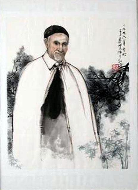 Watercolor; Vincent de Paul, standing, cassock, white cape, skullcap; pines and bamboo; Chinese inscription and red chop; original in Vincentian provincial house, Panningen