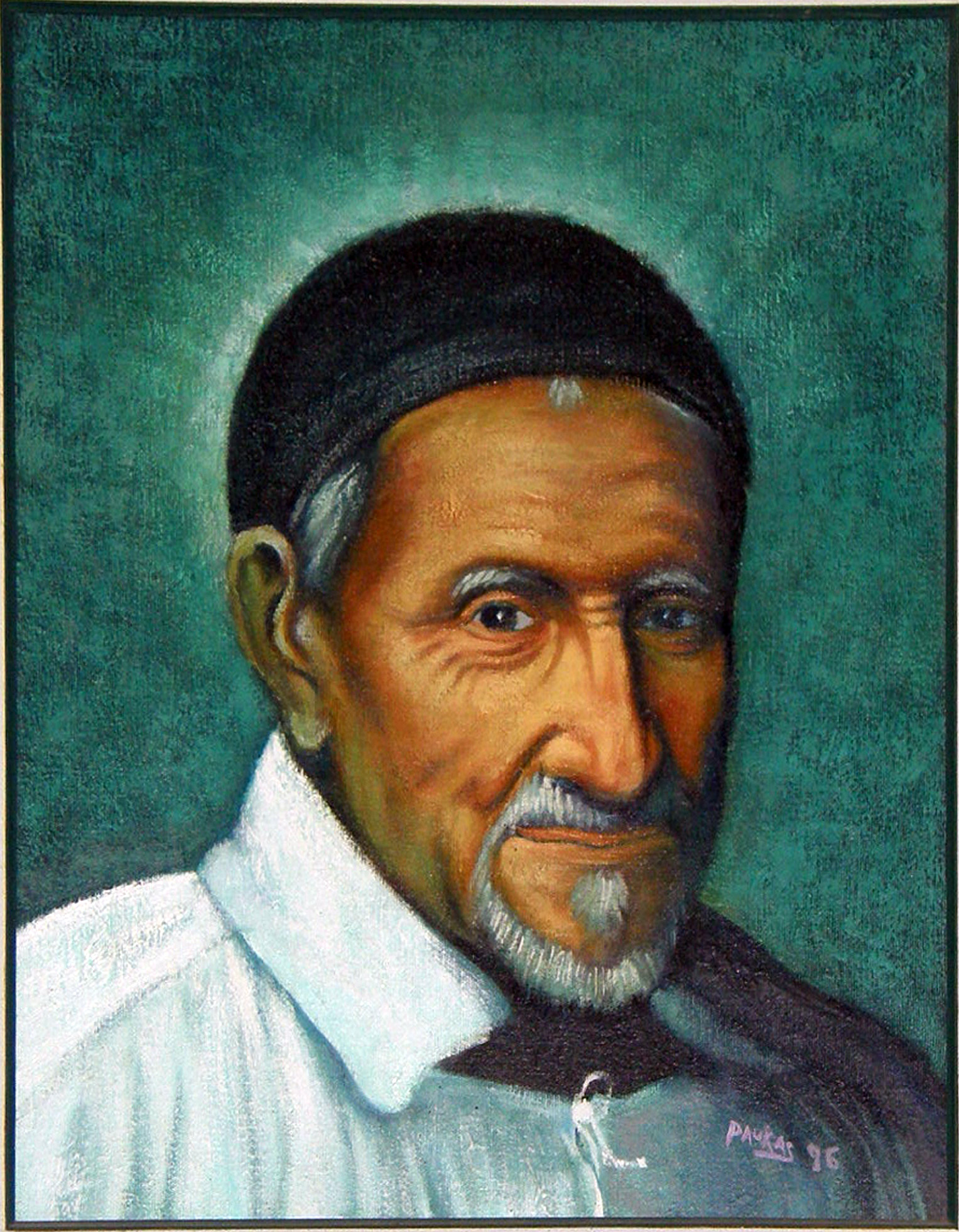 Vincent de Paul in choir dress; green background; original in Vincentian school, Lima, Peru, dated 1996
