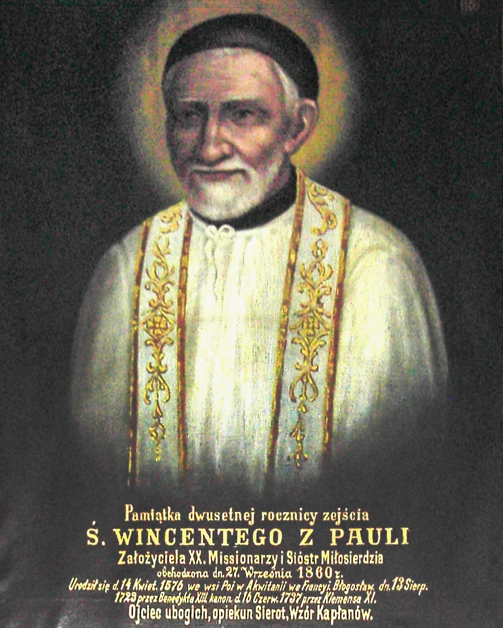 Vincent de Paul, cassock, surplice, stole, skullcap, halo; bicentennial of his death, 1860; original in Lublin, Daughters of Charity house
