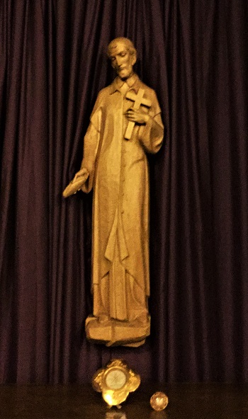 Statue, holding bread, cross; reliquaries