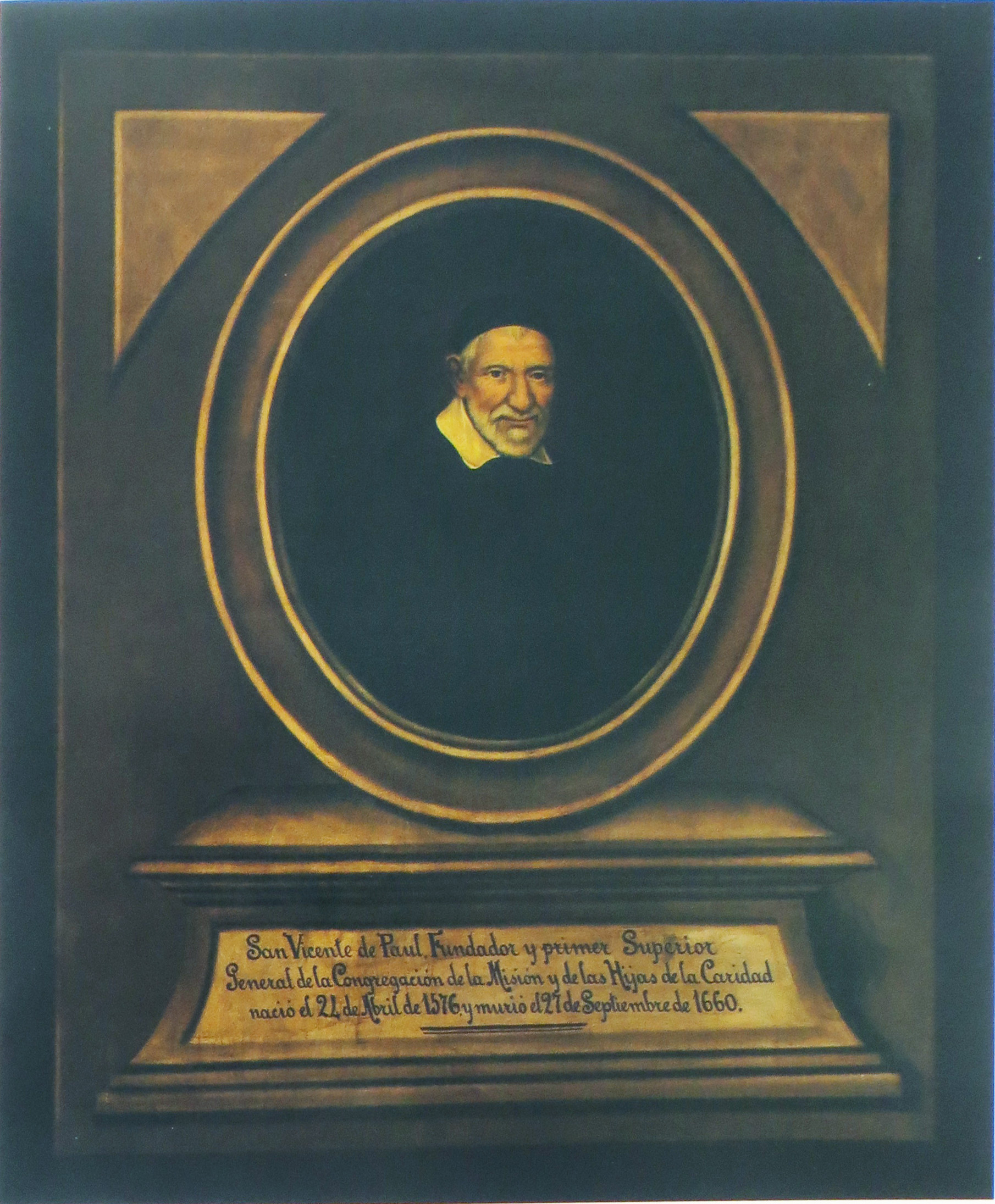 Oil on canvas; unknown artist; Spanish text: SVdP, founder and first superior general of the CM and of the DC, born 24 April 1576, died 27 September 1660
