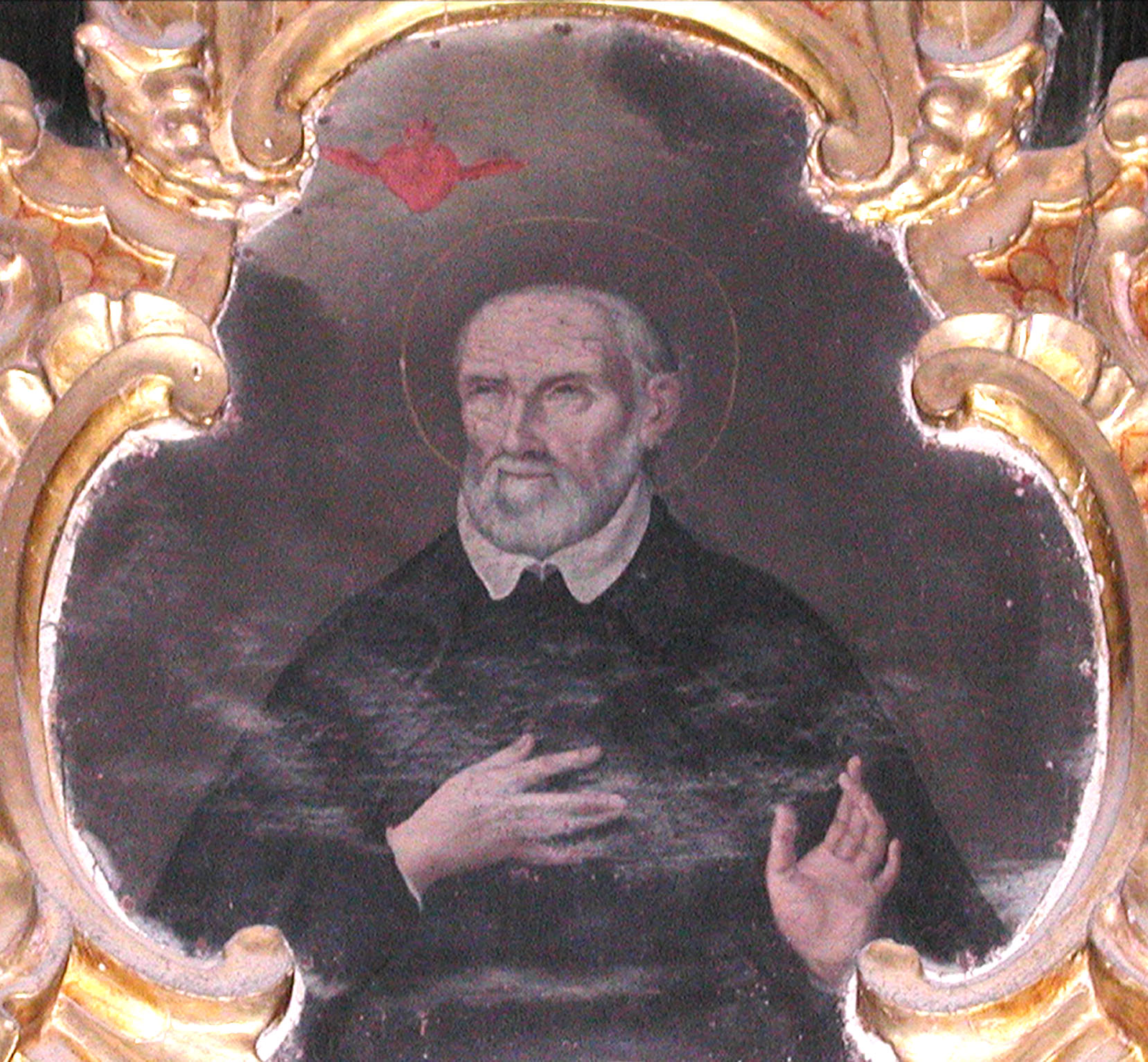 Oil painting above altar, gilded frame, detail; Vincent de Paul in cassock and cape, looking at red heart of charity above his head. Original in Vincentian chapel, Palma de Mallorca, Spain