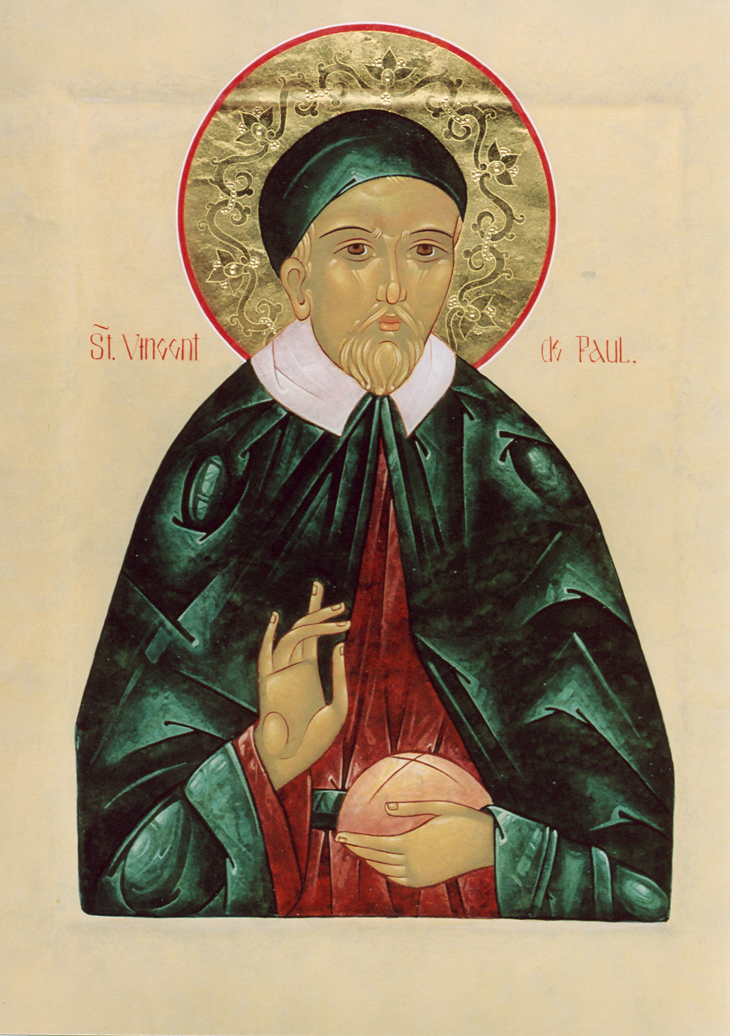 Painted panel, 2004; Vincent de Paul in cassock; cape, holding loaf of bread, right hand raised in blessing, fingers in Oriental style; original in St. Vincent de Paul church, Chicago. 2004; gift of Edward J. Tomasiewicz, CM.