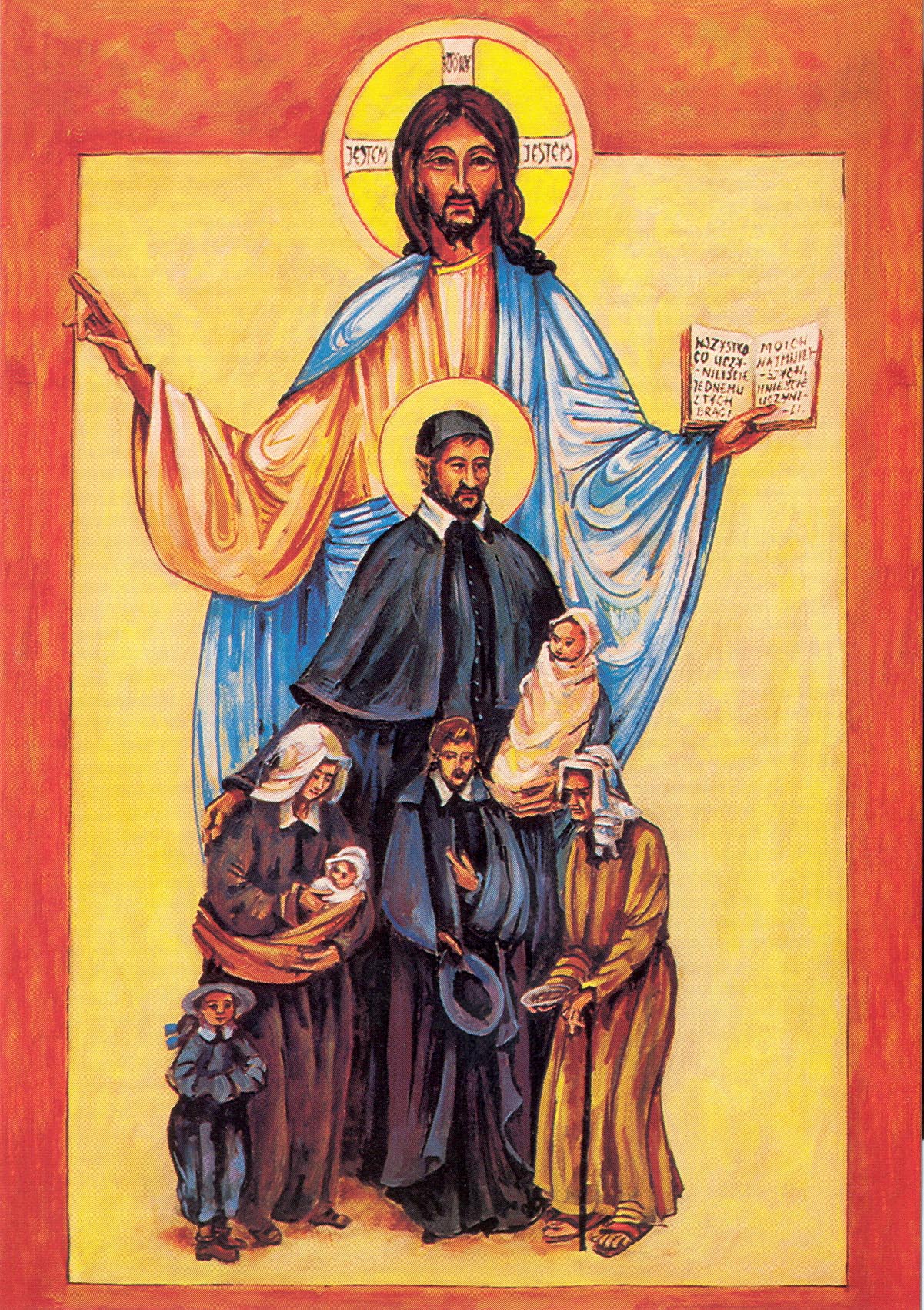 Icon design, Polish text; Vincent de Paul with Jesus behind, poor persons in front, with Vincentian priest; Polish version painted by Piszcek; original in Vincentian house, Krakow