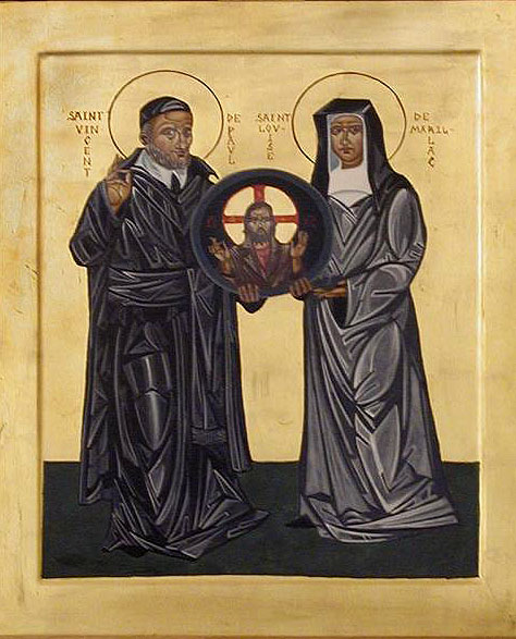Icon, Vincent de Paul and Louise de Marillac presenting Jesus, hands raised; original in Catholic Charities, Chicago