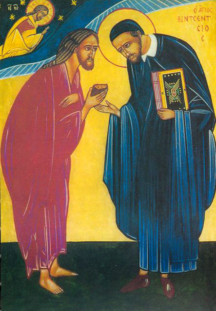 Painted panel, beggar like Jesus with bread, Vincent de Paul with book of Gospels; Jesus above in heaven, blessing. Vincent's name in Greek. Original in Poland, location ?; based on Beggar Christ in Chicago. Another in Kiev