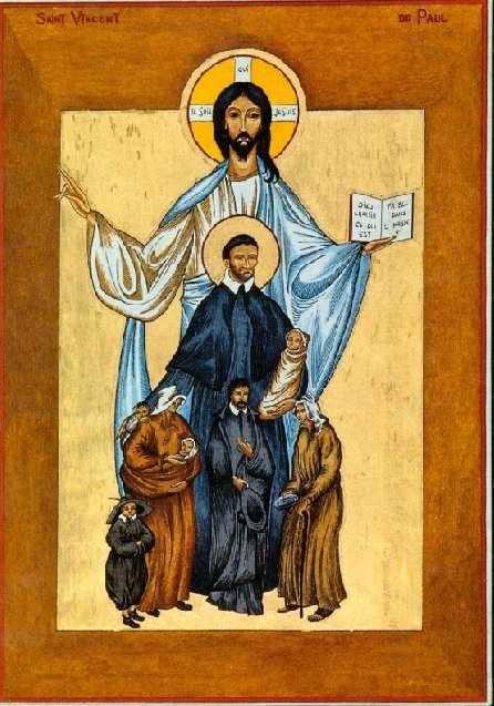 Icon design, Vincent de Paul with Jesus behind, poor in foreground, with Vincentian priest; French version