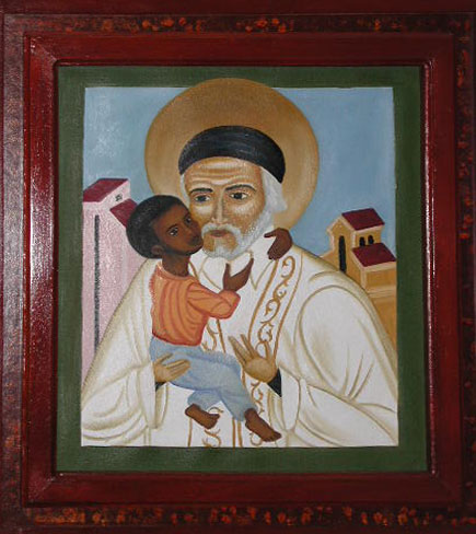 Framed oil painting; Vincent de Paul holding child; local copy in Panama of Lentz icon