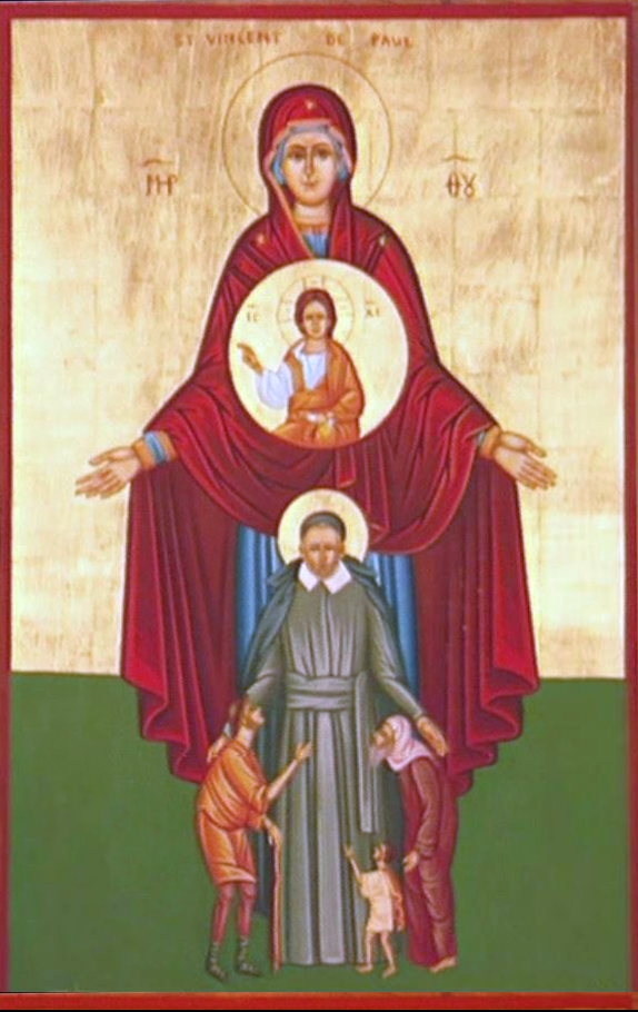 Virgin Mary, presenting Jesus, with VdP and poor persons