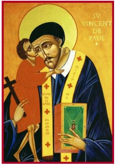 Painted panel; Vincent de Paul, gold stole, holding book and crucifix; child in his arms. Internet image. Original in Slovakia