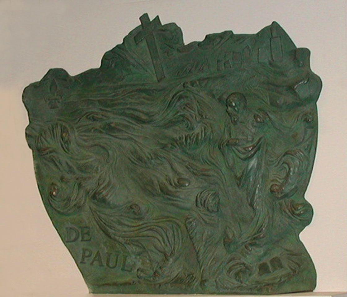 Bronze plaque, wall mounted; Vincent de Paul among poor, hilding infant; Chicago skyline above, with cross. Original in Richardson Library, DePaul University, Chicago