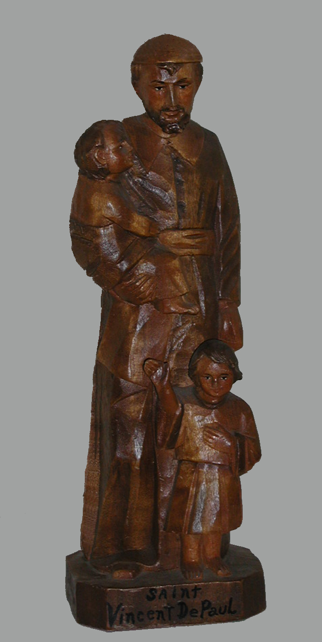 Carved wooden statue, Vincent de Paul, two children; original in Little Sisters of the Poor, St. Mary Home, Chicago