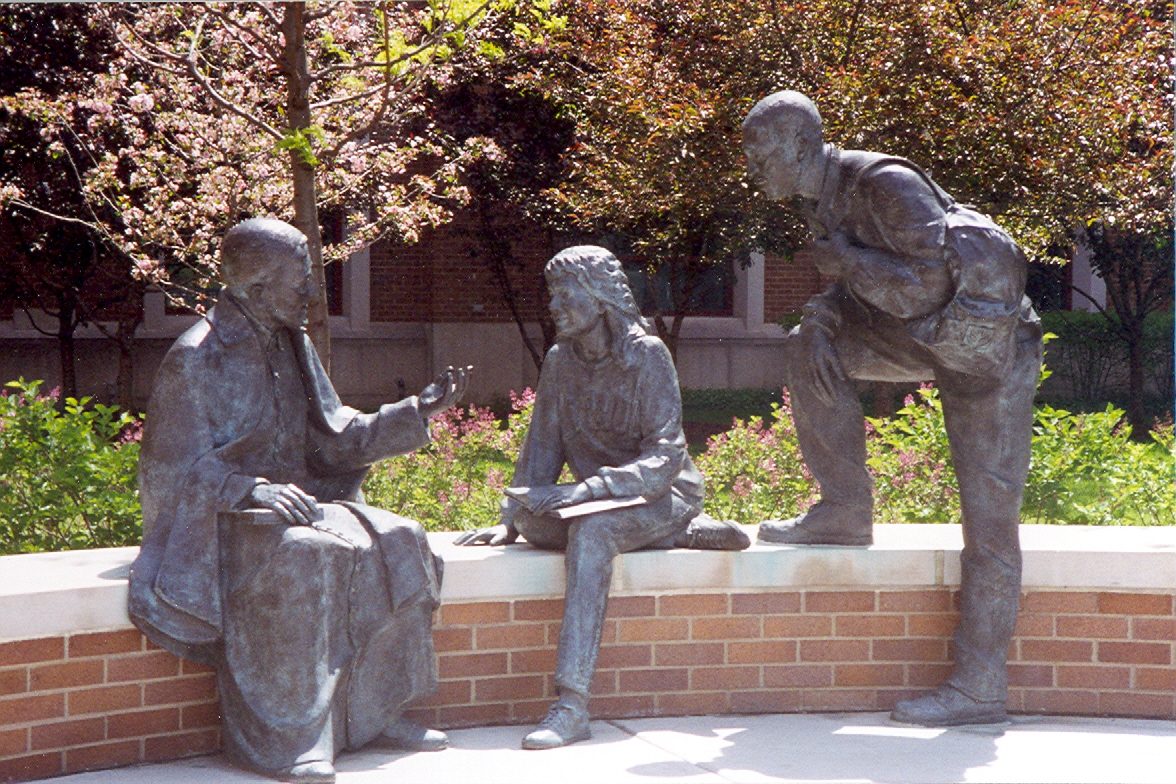 Bronze group; Vincent de Paul, seated, cassock, cape, skullcap, holding book, with two students; by Sr. Margaret Beaudette, SC, 1995; original at DePaul University