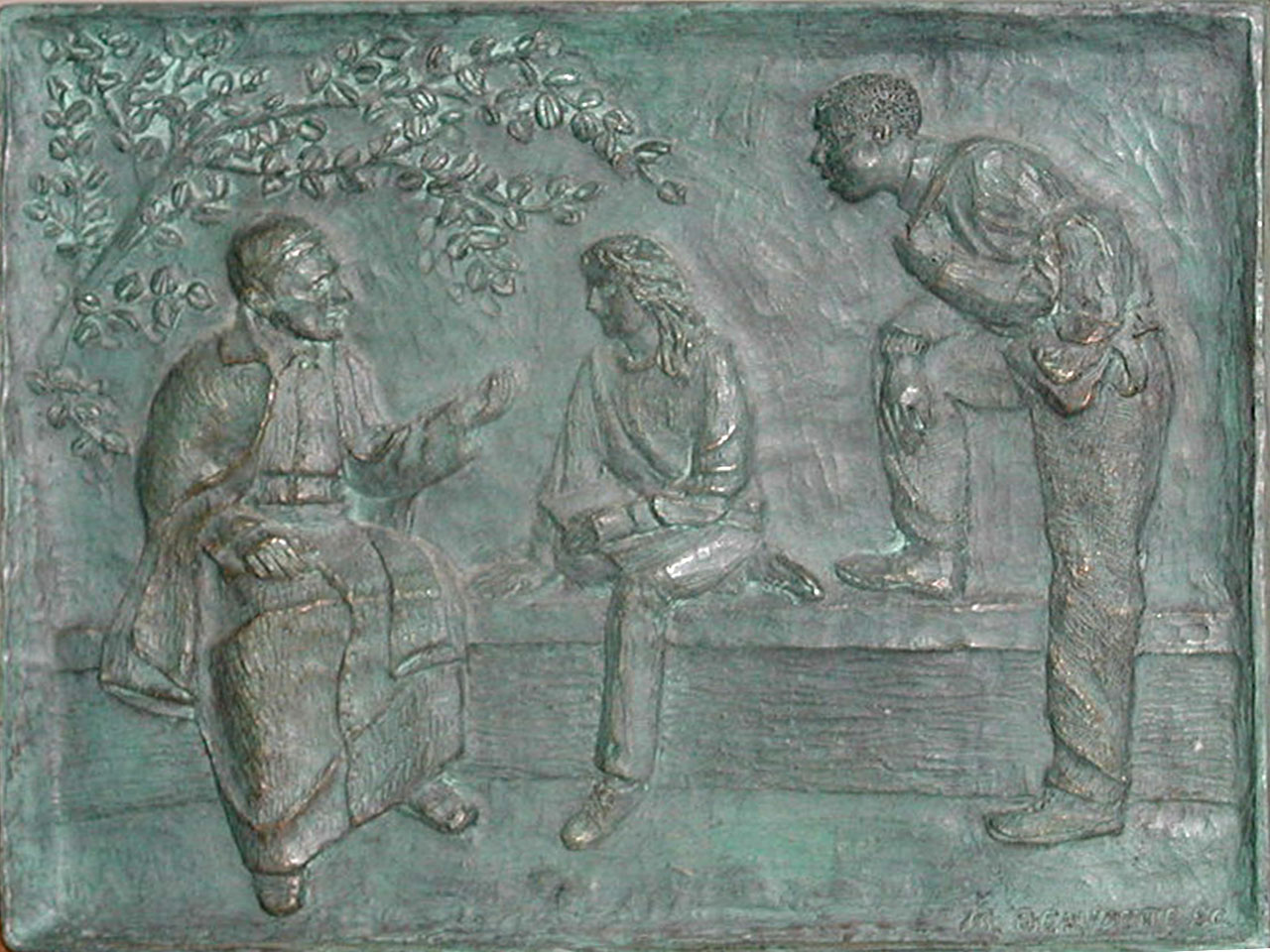 Bronze preliminary study, Vincent de Paul with two students; by Sr. Margaret Beaudette, SC; original at DePaul University
