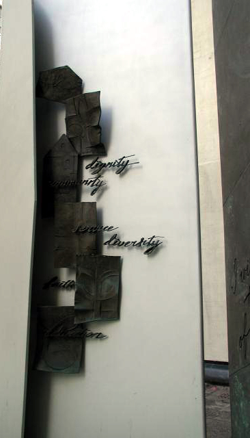 Steel sculpture group, Vincentian values, DePaul University, original at DePaul Center, Chicago