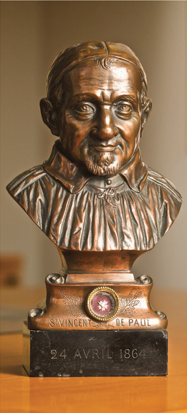 Bronze statuette, Vincent de Paul bust with relic; date 24 April 1864, to commemorate dedication of Berceau chapel; original at DePaul University