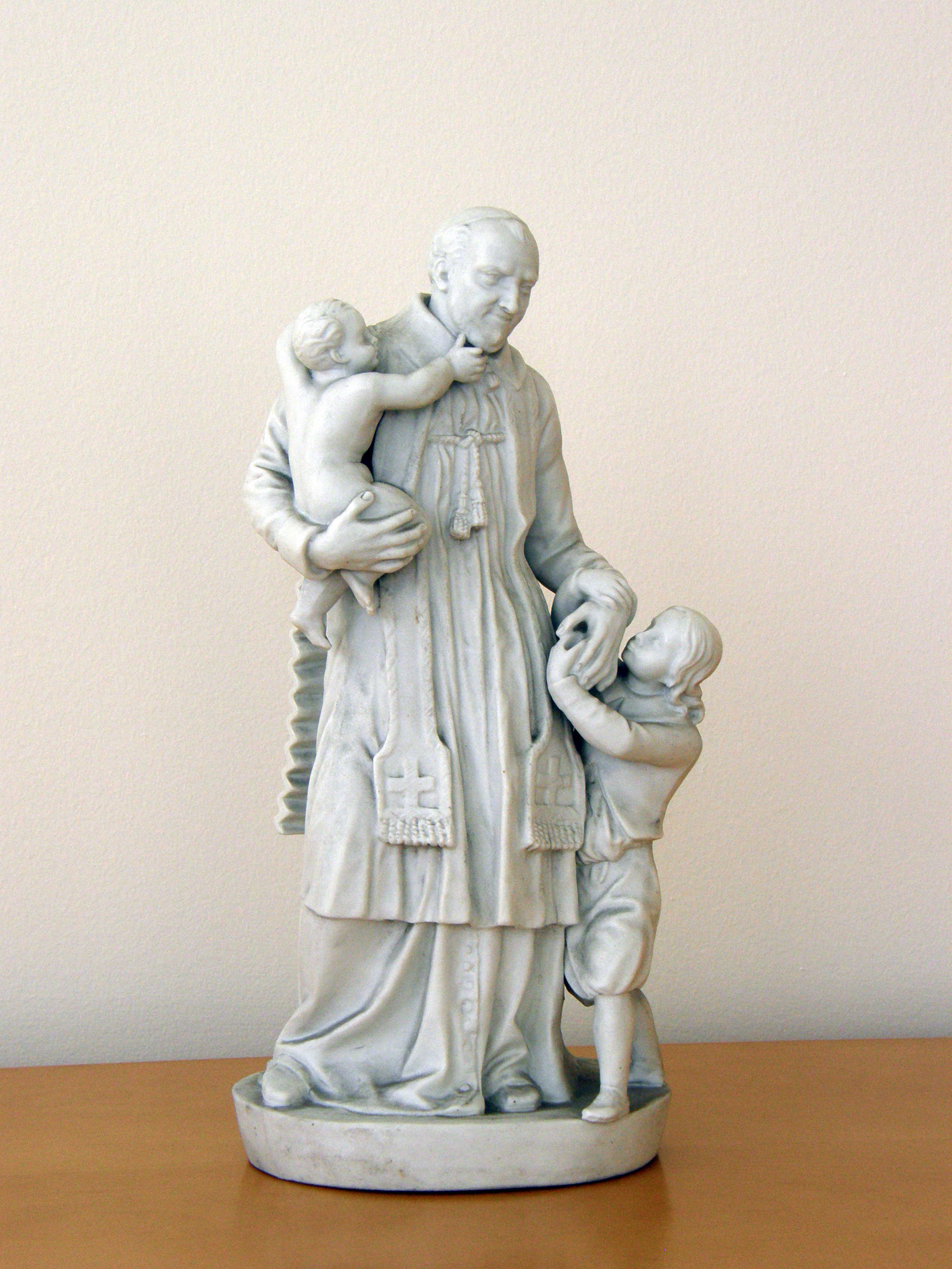 Bisque statuette; Vincent de Paul, standing, cassock, surplice (Paris style), stole, skullcap; two children; original at DePaul University