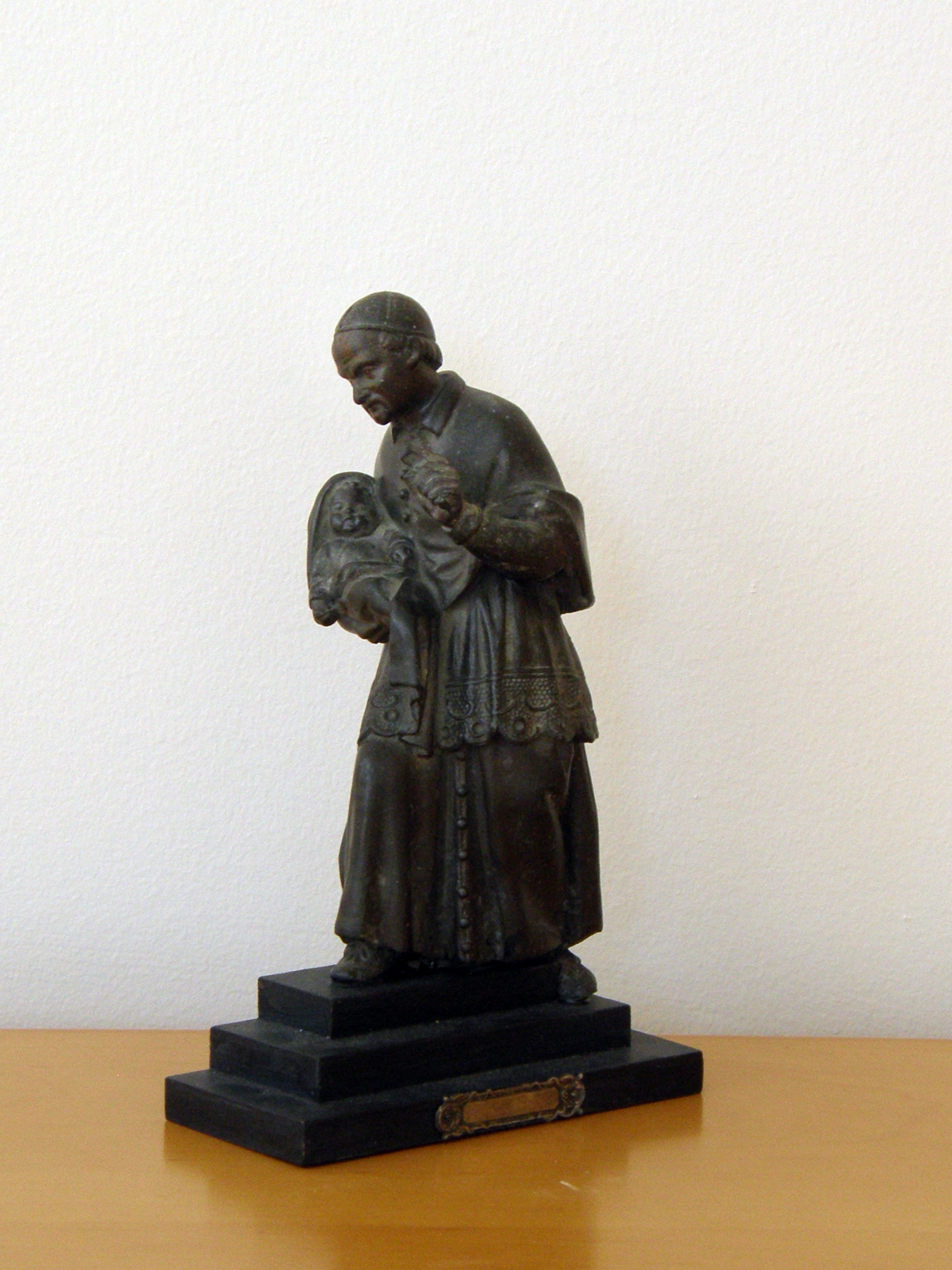 Metal casting; Vincent de Paul, standing, cassock, surplice, shoulder cape, skullcap, one foot on step; wooden base; original at DePaul University