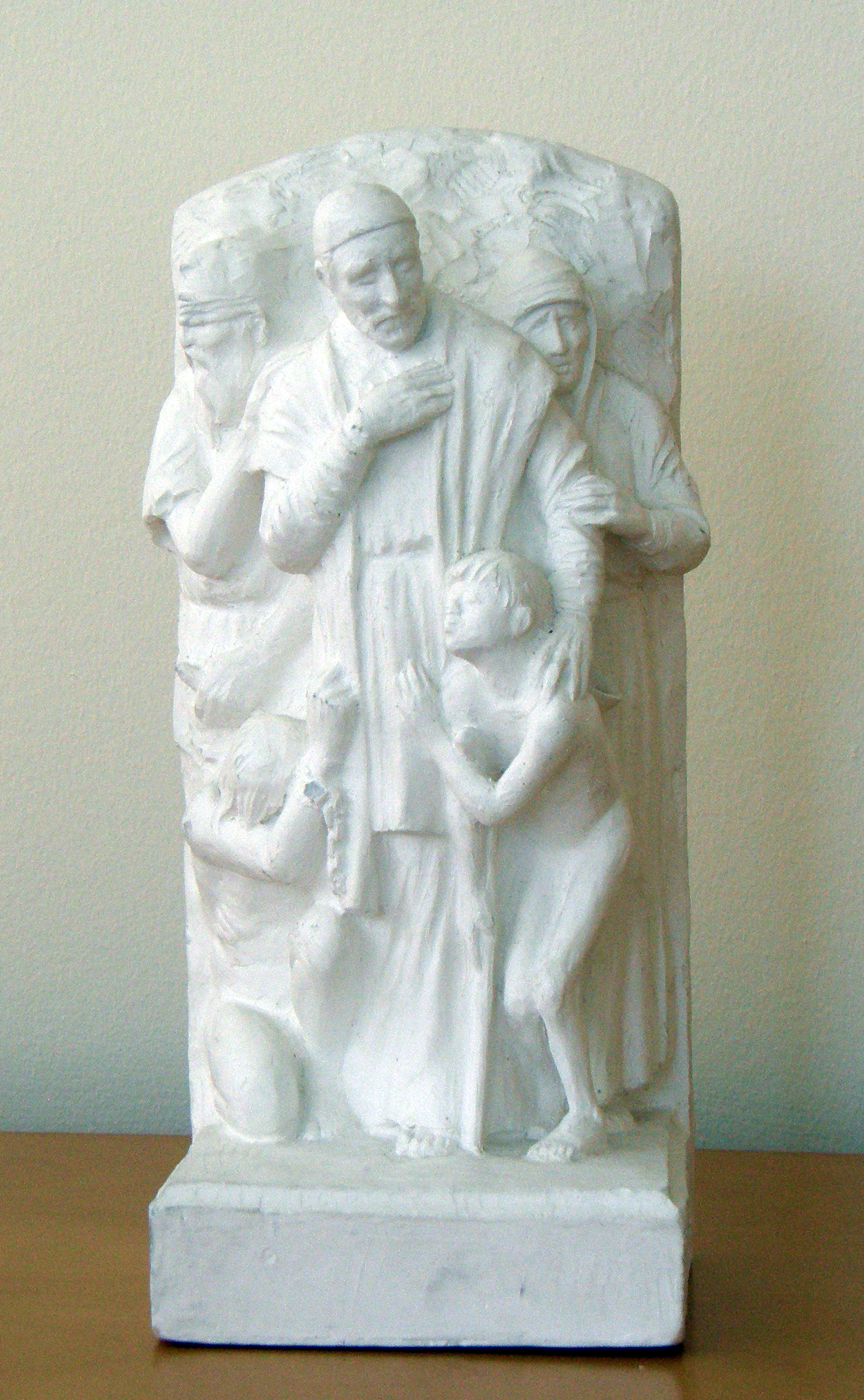 Plaster maquette, Vincent de Paul, standing, cassock, surplice, mantle, skullcap; Louise de Marillac behind; with figures represented handicapped, prisoner, child; original at DePaul University