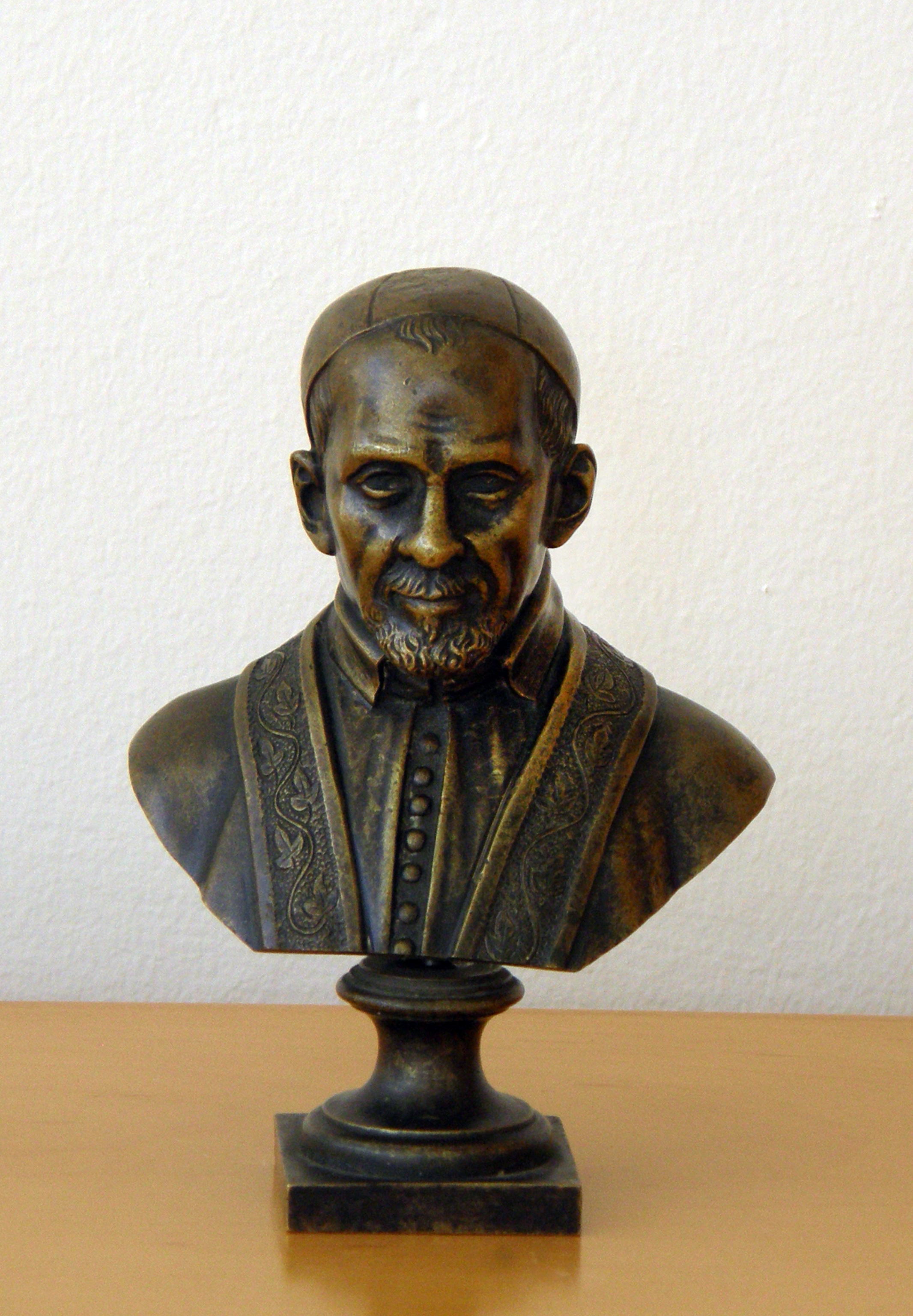 Cast metal; Vincent de Paul, cassock, surplice, stole, skullcap; original at DePaul University