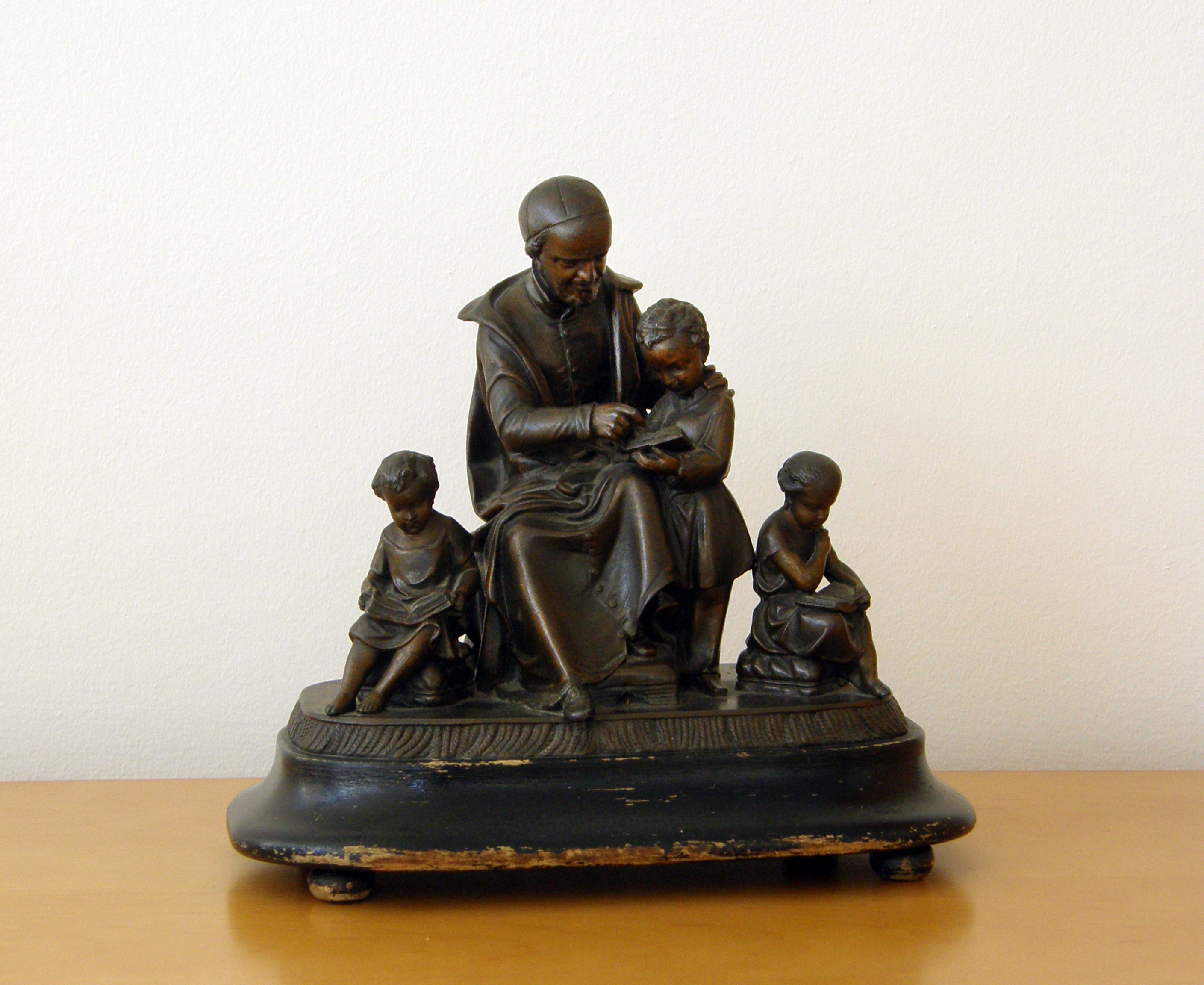 Cast metal on painted wooden base; Vincent de Paul, seated, cassock, mantle, skullcap; with three children; original at DePaul University