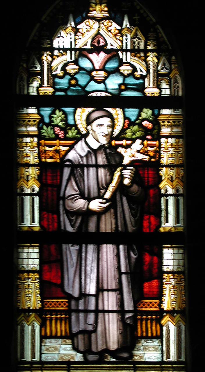 Vincent de Paul, standing, in cassock and mantle, holding large crucifix. Original in Vincentian house, location unsure, Netherlands.