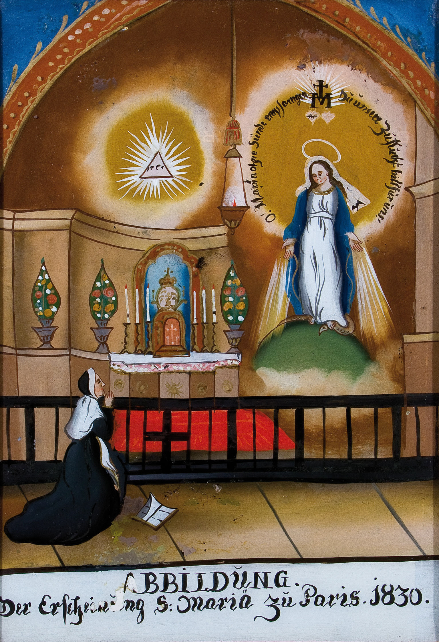 Text: Representation of the apparition of Holy Mary in Paris 1830. Painted on glass, data not given
