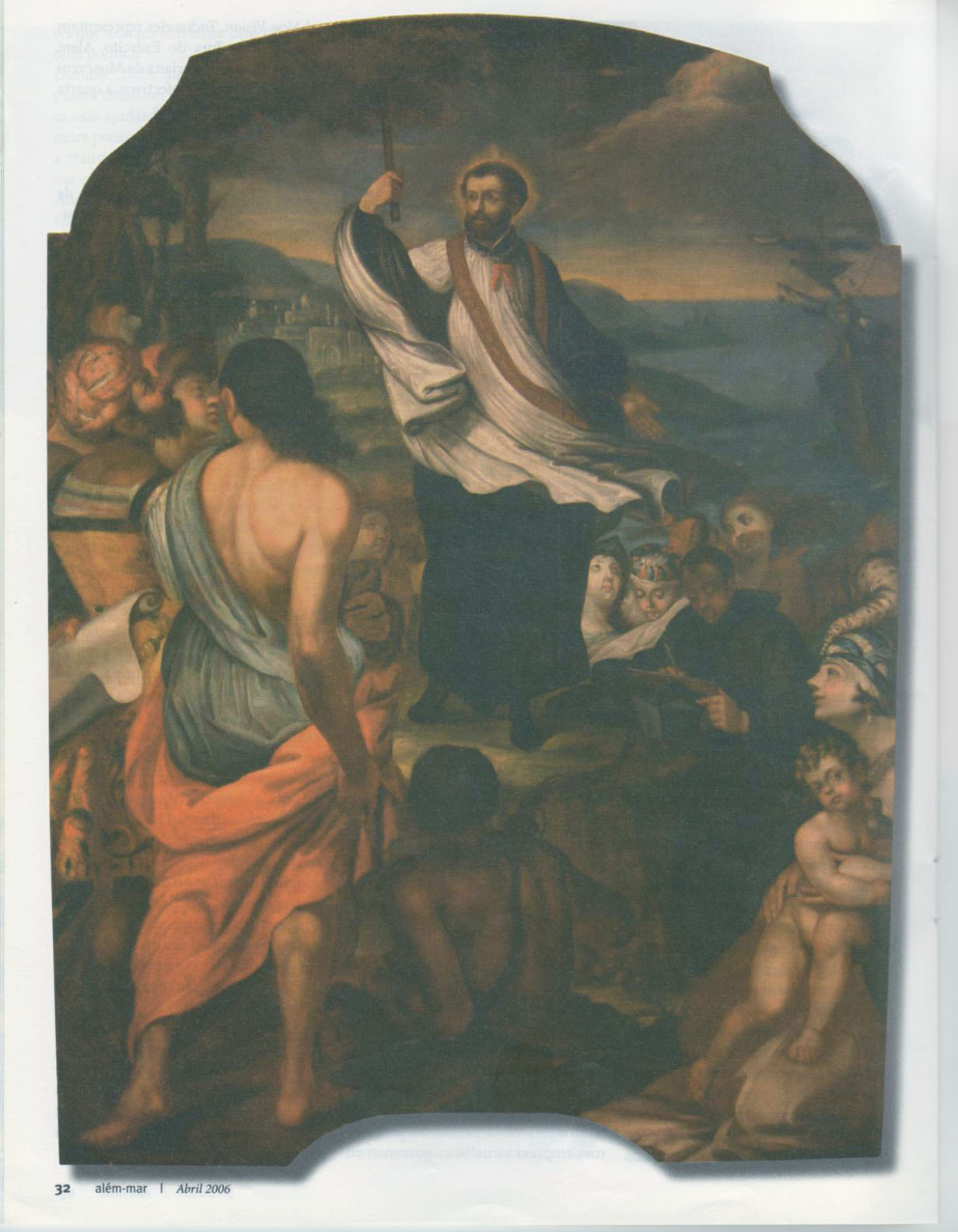 Painting; Francis Xavier, standing, cassock, surplice, stole, halo; preaching outdoors; ship and water in background; model for VIncent de Paul preaching; location of original unknown