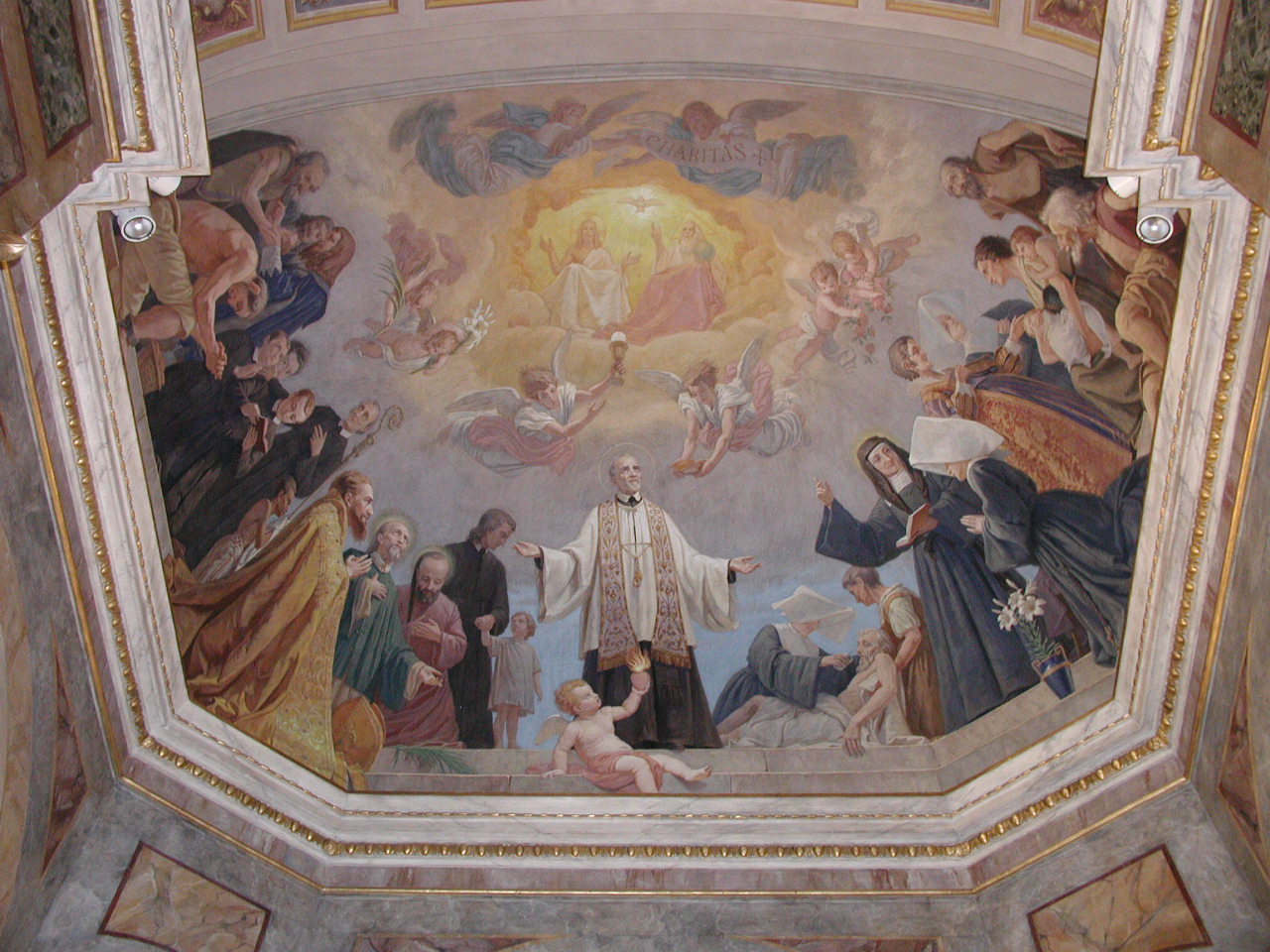 Ceiling painting; Vincent de Paul, standing, cassock, surplice, stole, surrounded by Vincentians and Daughters of Charity, saints, Louise de Marillac, angel with burning heart of charity; original in Collegio Leoniano, Rome
